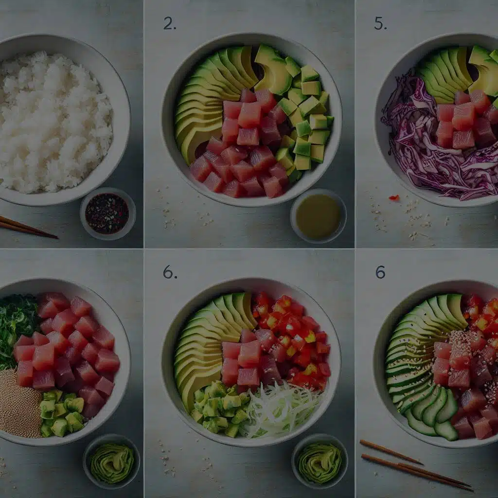 Une fois que tous vos ingrédients sont prêts, il est temps d’assembler votre poke bowl. Commencez par une base de riz, puis ajoutez le thon mariné. Disposez vos légumes de manière artistique autour du thon.